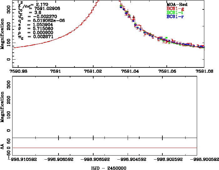 | tE(day) | q | s | u0 | α(radian) | ρ | πE,N | πE,E | χ² |