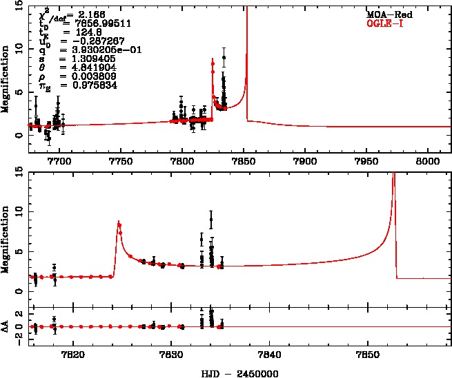 | tE(day) | q | s | u0 | α(radian) | ρ | πE,N | πE,E | χ² |