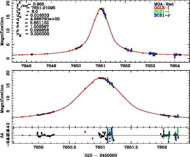 | tE(day) | q | s | u0 | α(radian) | ρ | χ² |