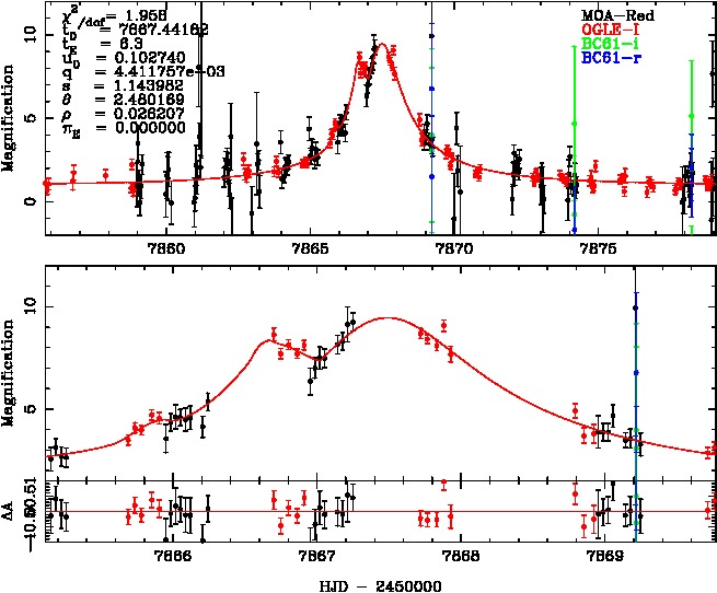 | tE(day) | q | s | u0 | α(radian) | ρ | χ² |