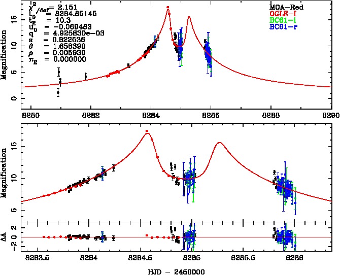 | t0(HJD-2450000) | tE(day) | q | s | u0 | α(radian) | ρ | χ² |