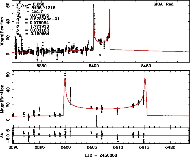 | t0(HJD-2450000) | tE(day) | q | s | u0 | α(radian) | ρ | πE,N | πE,E | χ² |