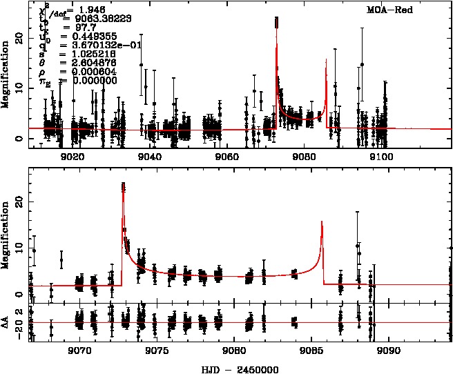 | t0(HJD-2450000) | tE(day) | q | s | u0 | α(radian) | ρ | χ² |