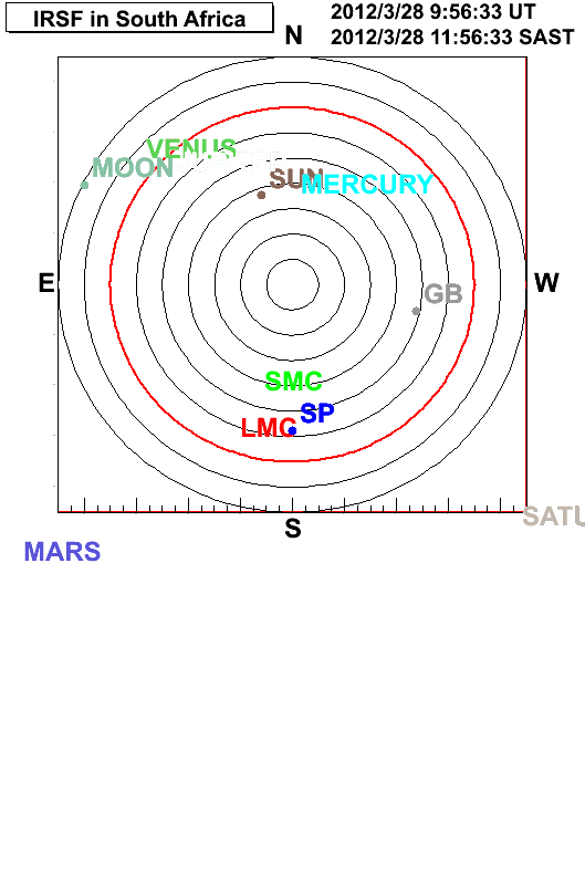 Each black circle indecates altitude of 0, 10, 30, 40, 50, 60, 70 and 80 degrees, and red circle is 20 degrees.